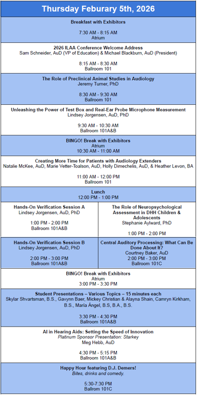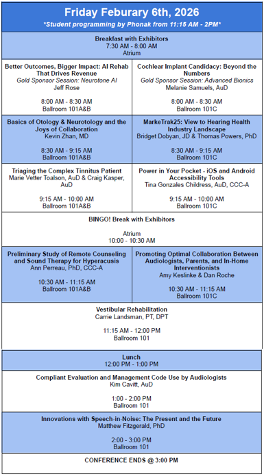 The conference runs from 7:30 AM - 5:30 PM on Thursday 2/5, followed by happy hour and a comedy show. On Friday 2/6, the conference runs from 7:30 AM - 3:00 PM. Please find the schedule above.